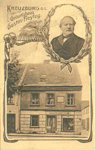 Kreuzburg, Rathaus, alte Postkarte aus: http://www.vogel-soya.de/bilder/Schlesphoto.html Es ist Mittag. Auf dem Marktplatz zu Kreuzburg in Oberschlesien drängt sich unter den wenigen schattenspendenden Bäumen alles Lebende zusammen. Es ist schön, auf einer solchen Schattenbank zu sitzen, wenn auch die vier alten Polinnen neben mir immer wieder dreiste, wortlose Versuche unternehmen, mein schmales Bankende noch weiter zu verkleinern. Unter einem der Nachbarbäume hantieren sechs polnische Arbeiter, offenbar mit der Aufgabe betraut, ein Stück Erdreich von seinen Trümmern zu befreien und es anschließend mit Pflastersteinen auszulegen. Von längeren Pausen unterbrochen, tragen immer je zwei der Männer ein Trümmerteil von dannen, um es in einem mitgeführten Karren abzulegen. Zwei weitere Männer bringen dann von einem anderen Gefährt als Ersatz einen Pflasterstein herbei. Die beiden noch verbleibenden Arbeiter stehen beiseite, beobachten das Geschehen und überwachen die Verteilung der mitgebrachten Flaschen. In einem der vielen verfallenden Bürgerhäuser ringsum ist meine Großmutter geboren worden, die Enkelin des Görlitzer Bürgermeisters. Da die Familie schon bald nach der Geburt der kleinen Tochter weggezogen ist, konnte mir meine Großmutter ihr Geburtshaus nicht genau beschreiben. Irgendwo hier in der Nähe aber muß es gewesen sein, heute vor genau 80 Jahren, 3 Monaten und 23 Tagen, in einer Zeit, als Arbeiter, welche Pflastersteine trugen, und als Frauen, welche über Mittag auf den Bänken des Marktplatzes saßen, als all diese noch meine Sprache redeten. Kirchplatz Backsteinrot, schwer und gedrungen steht etwas abseits vom Markt die ehemalige evangelische, nun aber wie alle schlesischen Kirchen rekatholisierte Stadtkirche Kreuzburgs. Hier heirateten meine Großeltern. Hier wurde meine Großmutter getauft. Der Vorplatz der Kirche ist überschattet vom Laub alter Ahornbäume. Unter einem dieser Bäume steht eine steinerne Säule, deren Zweck es einmal gewesen ist, mit einem eingemeißelten Dichterspruch die Vorübergehenden aus ihren Alltagsgedanken herauszulocken. Dieser Zweck hat sich derzeit erledigt, denn es gibt kaum noch jemanden, der hier vorübergeht. Es ist still unter den alten Ahornbäumen Kreuzburgs, still und leer von Menschen. Überdies sind die Worte des Spruches, obwohl sie von der neuen Bevölkerung Kreuzburgs ohnehin nicht verstanden würden, mit einem harten Gegenstand zerstört. Nur zwei Dichterworte sind noch zu erkennen: "Hoffnung" und "Wiedersehen". Der Spruch könnte von Gustav Freytag stammen, dem schlesischen Dichter, der hier in Kreuzburg geboren wurde, dessen Gedenkbrunnen zwar aus der Stadt fortgeräumt worden ist, dessen Bücher aber noch immer in der Bibliothek der Breslauer Literaturprofessorin stehen, z. B. das Bild vom Leben im alten Schlesien: Soll und Haben.